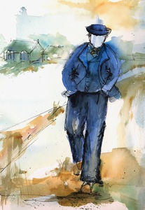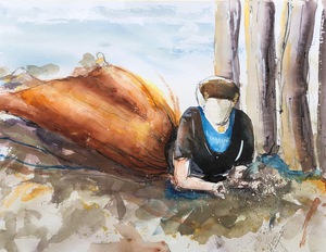 Mens en dier, in aquarel.