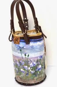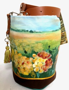 2021Eerst een schilderij, een panorama van een bloeiend lndschap. Ronde tas, rondom bloemen met schouderhengsel. Gevoerd. Bodem 18 cm rond