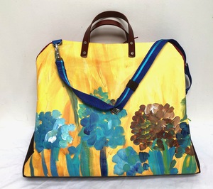 2022Acryl schilderij op doek, daarvan een tas gemaakt. met leer, katoen, ritsen en alles wat inen bij een tas hoor. Vol met herinneringen