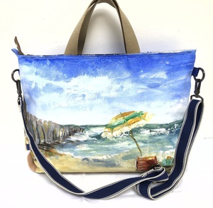 2022Aan het strand in volle dracht. Acryl op doek, leren achterkant, gehaakte schouderriem.