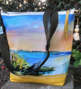 Elke tas begint als een schilderij, op geprepareerd schildersdoek. Als ik tevreden ben over het schilderij vervolgt het heerlijke proces van creeën, bijpassende stofjes, welk model, welke sluiting enz. enz. Tot er een unieke en origineel tas is geboren.